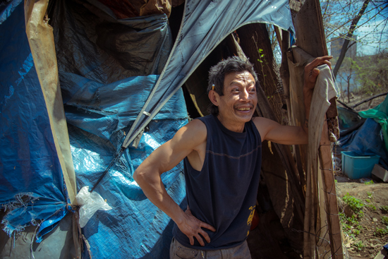 Mao’s commitment to chipping away at the problem of homelessness in Lowell goes beyond the youth who come to UTEC for assistance. He frequently visits shelters and other hotspots around the city, checking in with previous acquaintances young and old, offering basic hygiene products and food supplies, and making new connections. For some, home is found in semi-permanent collections of tents near rivers, woods, and bridges around Lowell. These tent cities, many of which have been or will soon be removed, have been home to some residents for many years. Now many sites lie abandoned, the residents having left ahead of city efforts to clear them out. A walk through these partially abandoned homes reveals images both sad and uplifting, everyday and sublime: a trampoline with a gorgeous river view; partially charred family photos; pet rabbits in orderly hutches, with an extra constructed for donation to the animal shelter; and ingenious repurposing, recycling, and reusing.