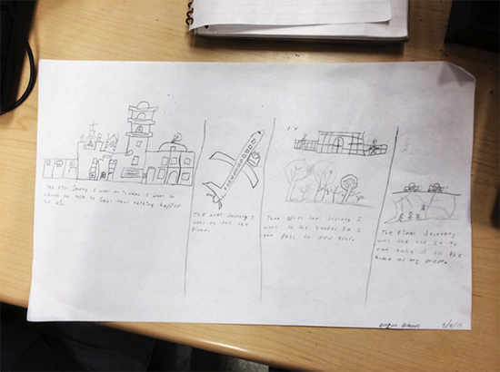 First he drew an intricate picture of a church. He wrote underneath, “the first journey I went on is when I went to church to talk to God that nothing happen to us.” Next he drew a plane shooting upward into the sky. He then depicted trees with snakes hanging from them and a large wall in the distance that he called the frontera. The last image was of cars driving away. One by one he worked out his captions and wrote them under the pictures. Brayon depicted his journey immigrating to the United States.